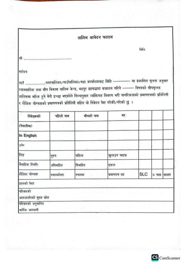 वहाल विटौरी शुल्क पेश गर्ने निवेदन फारम