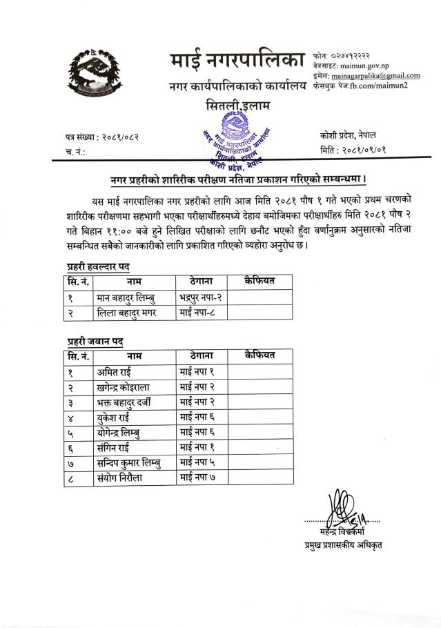 नगर प्रहरी शारीरिक परीक्षण नतिजा प्रकाशन गरिएको सम्बन्धमा ।