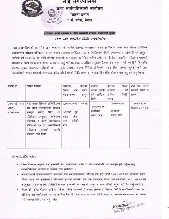 नदि जन्य पदार्थ संकलन र विक्री सम्बन्धि बोलपत्र आव्हानको सूचना