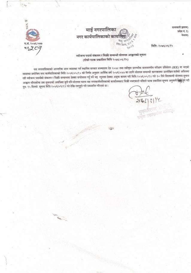 नदि जन्य पदार्थ संकलन र विक्री सम्बन्धि बोलपत्र आव्हानको सूचना