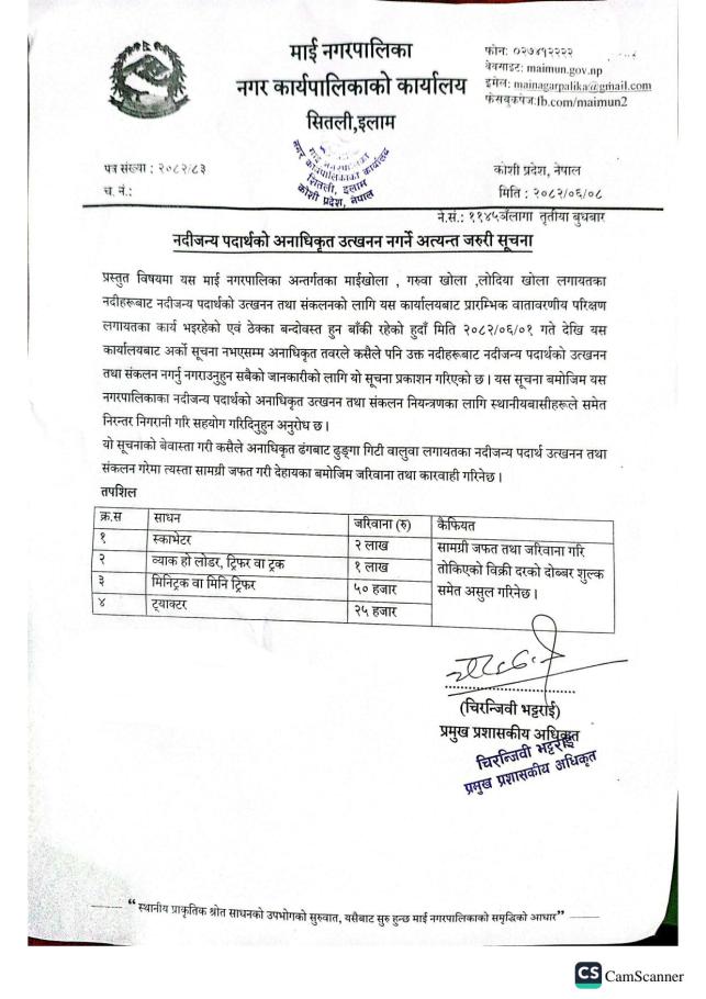 नदीजन्य पदार्थको अनाधिकृत उत्खनन नगर्ने सम्बन्धी अत्यन्त जरुरी सूचना ।