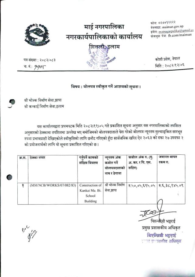 बोलपत्र स्वीकृत गर्ने आशयको सूचना ।