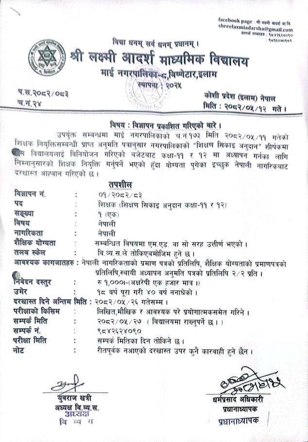 श्री लक्ष्मी आदर्श मा वि को विज्ञापन प्रकाशन गरिएको सम्बन्धी सूचना ।