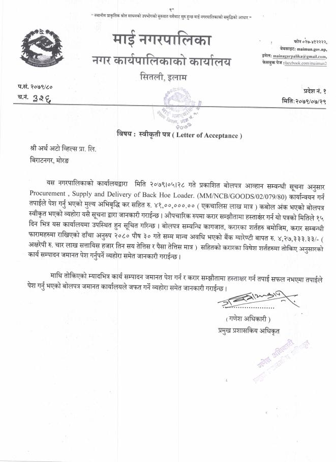 » स्वीकृति पत्र - Procurement, Supply and Delivery of Back Hoe Loader